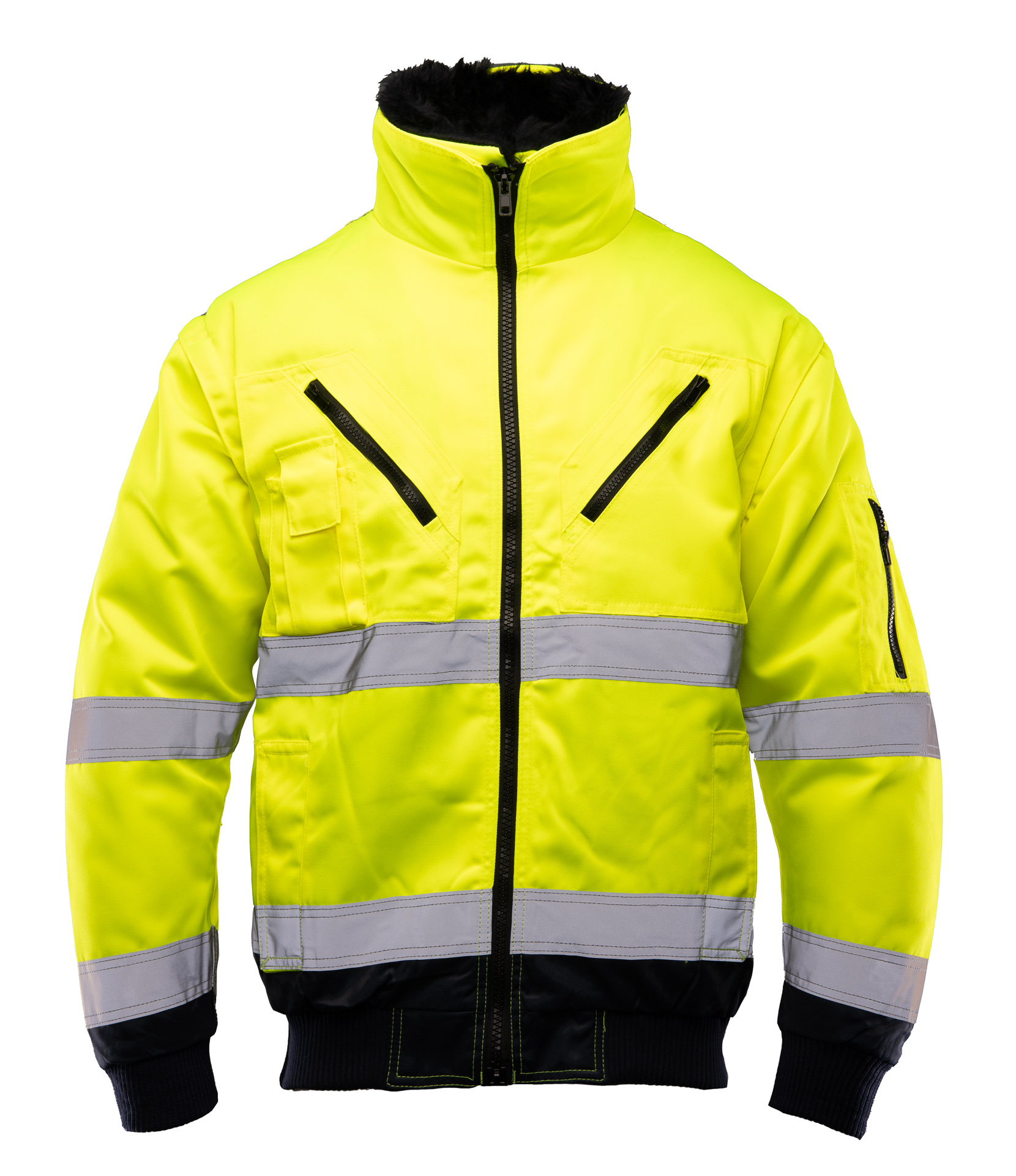 .Typ:: kurtka typu BOMBER z podwójnymi pasami odblaskowymi,; ..Rodzaj zapięcia:: zapinana na zamek kostkowy,; .Materiał:: Poliester/Bawełna (80% /20%),; .Ocieplina:: wypinana ocieplina ze sztucznego futra,; 100% poliester, gramatura 500 g/m2,; .Podszewka:: 100% poliester 120 g/m2,; .Budowa/szycie:: możliwość zrobienia kamizelki – odpinane na zamek rękawy z pasami odblaskowymi; kołnierz dodatkowo ocieplony ociepliną ze sztucznego futra,; .Kieszenie:: kieszeń na długopisy,; na lewym rękawie, kieszeń zapinana na zamek,; dwie dolne kieszenie kryte listwą,; wewnętrzna kieszeń na dokumenty,; górne kieszenie zapinane na zamek kostkowy,; kieszeń na komórkę,; .Rękawy/mankiety:: mankiety przy rękawach zakończone ściągaczem,; .Regulacja obwodu:: na dole kurtki gumka ściągająca, dzięki czemu kurtka nie odstaje i zabezpiecza przed wiatrem,; .Elementy odblaskowe:: pasy odblaskowe,;