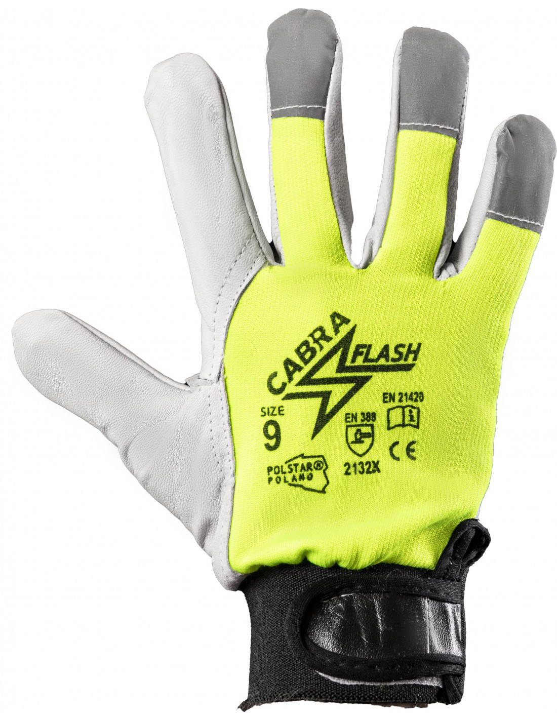 ..Rodzaj rękawicy:: rękawica wzmacniana skórą,; ..Część dłoniowa:: kciuk i palec wskazujący ze skóry,; część dłoniowa wykonana z jednego kawałka skóry,; skóra w jasnym kolorze,; ze skóry licowej koziej,; końcówki palców zakończone HI VI taśmą odblaskową; wysokiej jakości skóra; ..Materiał/Dzianina:: bawełniana dzianina interlock, ; w kolorze żółtym HI-VI,; ..Mankiet/zakończenie:: elastyczny ściągacz zapinany na rzep,; ..EN 388 – Odporność na uszkodzenia mechaniczne:: 2: odporność na ścieranie,; 3: odporność na przedarcie,; 2: odporność na przebicie,; X – odporność na przecięcie wg ISO 13997; 1: odporność na przecięcie,;