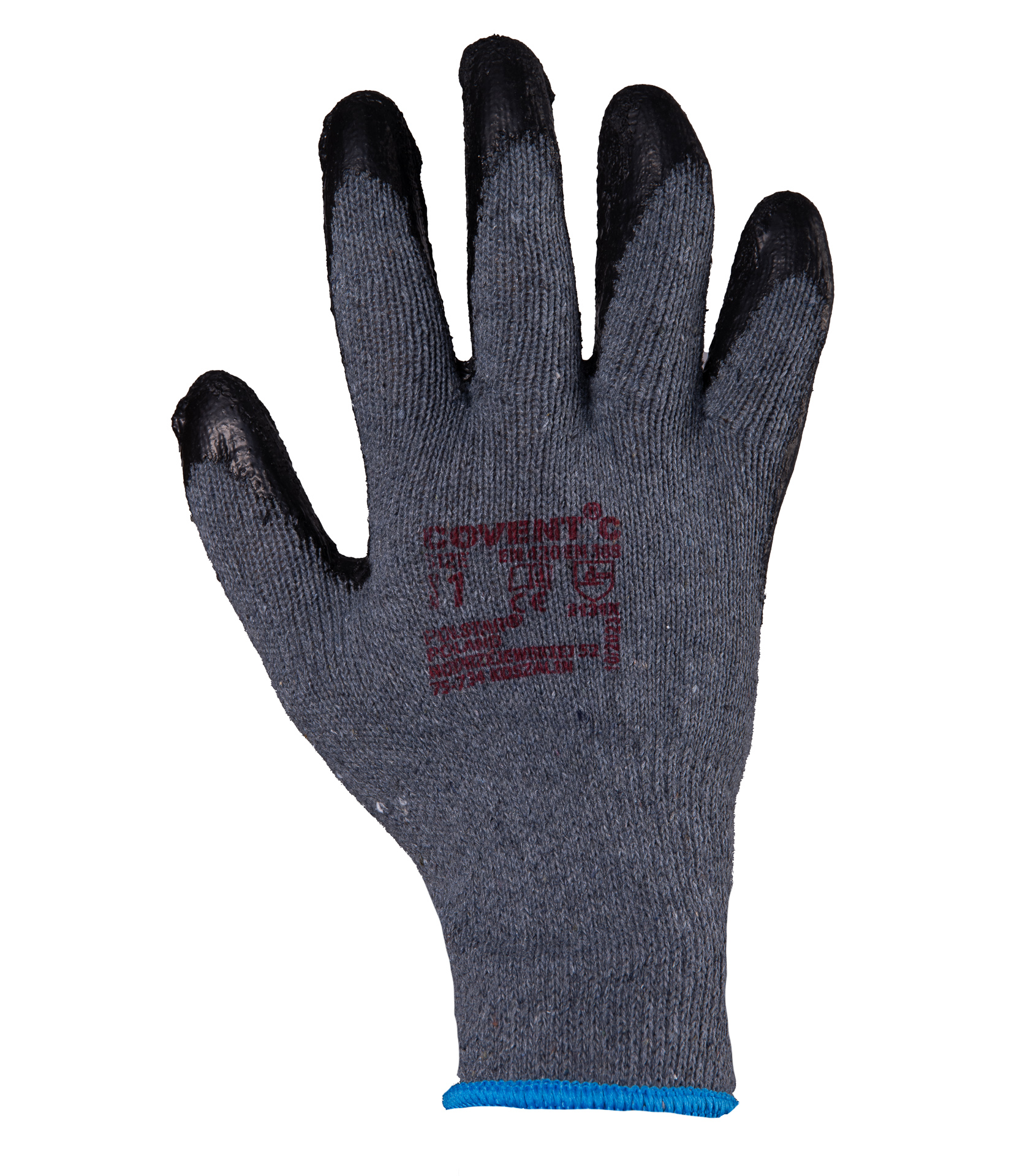 ..Rodzaj rękawicy:: rękawica powlekana,; ..Część dłoniowa:: powleczona szorstkowanym lateksem,; w kolorze czarnym,; ..Materiał/Dzianina:: dzianina bawełniano-poliestrowa,; w kolorze szarym,; ścieg 10G,; ..EN 388 – Odporność na uszkodzenia mechaniczne:: 2: odporność na ścieranie,; 1: odporność na przecięcie,; 3: odporność na przedarcie,; 1: odporność na przebicie,; X – odporność na przecięcie wg ISO 13997;