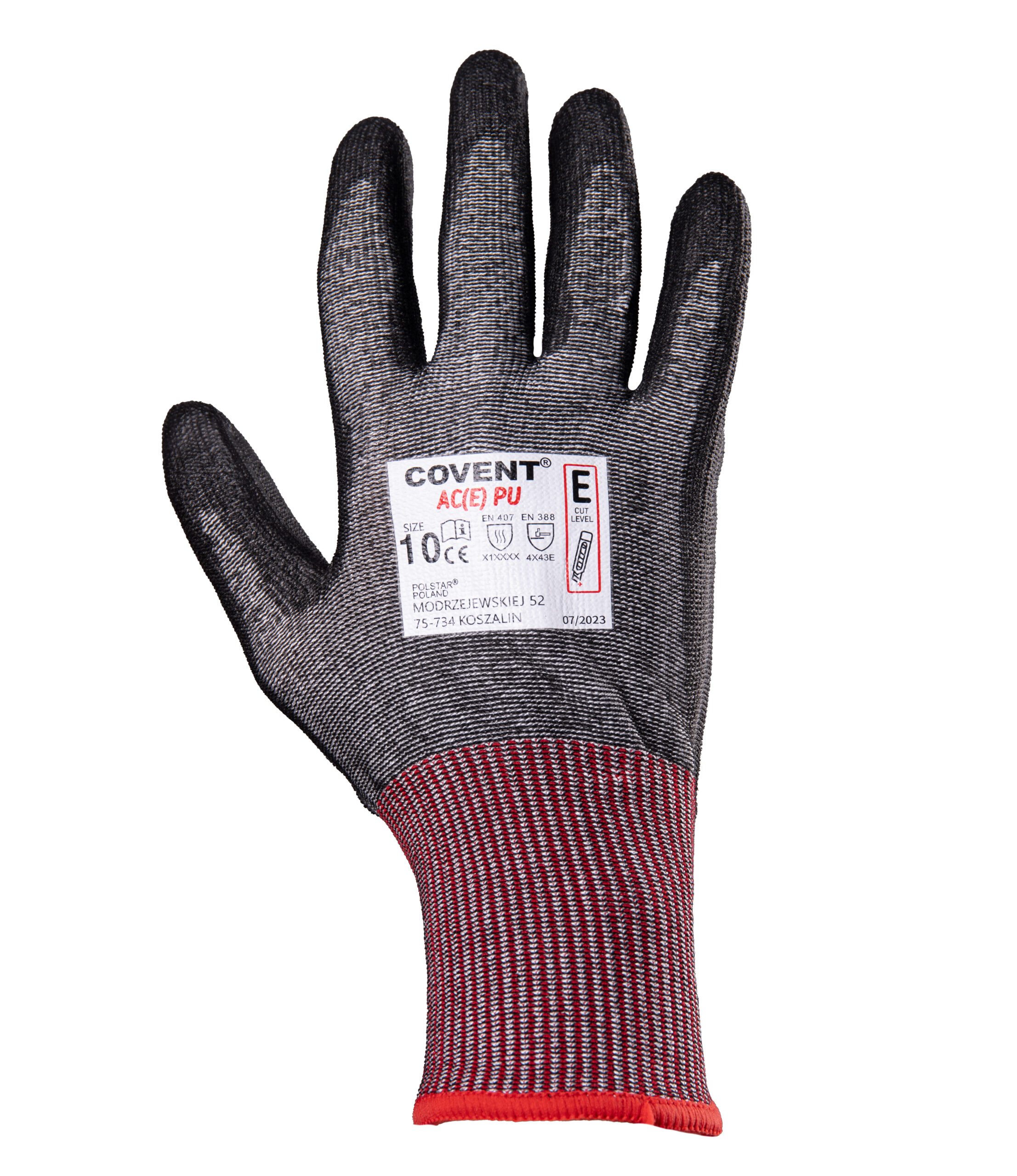 ..Rodzaj rękawicy:: rękawica powlekana,; ..Część dłoniowa:: Powleczenie ½,; w kolorze czarnym,; Powleczona poliuretanem,; ..Materiał/Dzianina:: włókno z mieszanki materiałów: poliester, spandex, włókno szklane oraz HDPE,; ..Mankiet/zakończenie:: zakończona ściągaczem,; ..EN 388 – Odporność na uszkodzenia mechaniczne:: 4: odporność na ścieranie,; 4: odporność na przedarcie,; 3: odporność na przebicie,; E – odporność na przecięcie wg ISO 13997; X: odporność na przecięcie; ..EN 407- Odporność na gorąco i ogień:: 1 – odporność na ciepło kontaktowe; X – odporność na promieniowanie cieplne; X – odporność na zapalenie; X – odporność na ciepło konwekcyjne; X – odporność na małe rozbryzgi metalu; X – odporność na duże rozbryzgi metalu;