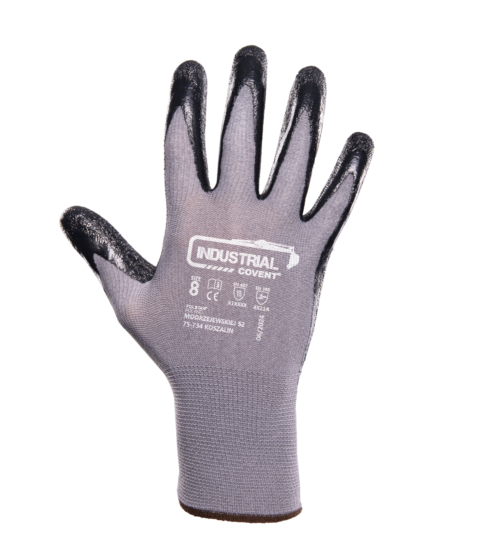 ..Rodzaj rękawicy:: rękawica powlekana,; ..Część dłoniowa:: Powleczenie ½,; powleczona szorstkowanym nitrylem; ..Materiał/Dzianina:: mieszanka poliestru i spandeksu; ..EN 388 – Odporność na uszkodzenia mechaniczne:: 4: odporność na ścieranie,; 2: odporność na przedarcie,; 1: odporność na przebicie,; X: odporność na przecięcie; A – odporność na przecięcie wg ISO 13997; ..EN 407- Odporność na gorąco i ogień:: 1 – odporność na ciepło kontaktowe; X – odporność na promieniowanie cieplne; X – odporność na zapalenie; X – odporność na ciepło konwekcyjne; X – odporność na małe rozbryzgi metalu; X – odporność na duże rozbryzgi metalu;