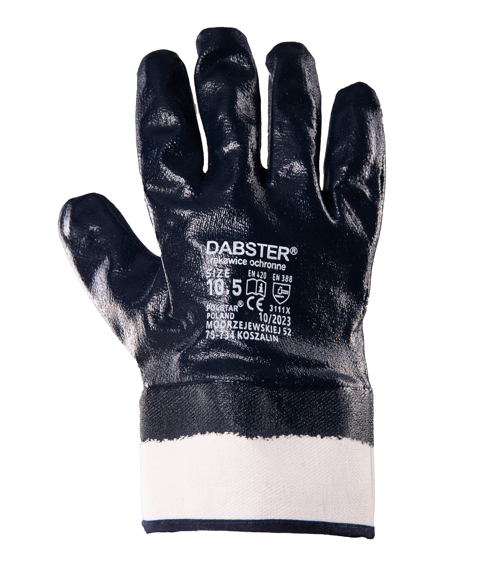 ..Rodzaj rękawicy:: rękawica powlekana,; ..Część dłoniowa:: Powleczenie pełne,; powleczona nitrylem,; w kolorze ciemnoniebieskim,; ..Materiał/Dzianina:: w kolorze naturalnym,; wykonane z bawełny,; ..Mankiet/zakończenie:: wykonany z usztywnionego drelichu,; ..EN 388 – Odporność na uszkodzenia mechaniczne:: 1: odporność na przecięcie,; 1: odporność na przedarcie,; 1: odporność na przebicie,; 3: odporność na ścieranie,; X – odporność na przecięcie wg ISO 13997;