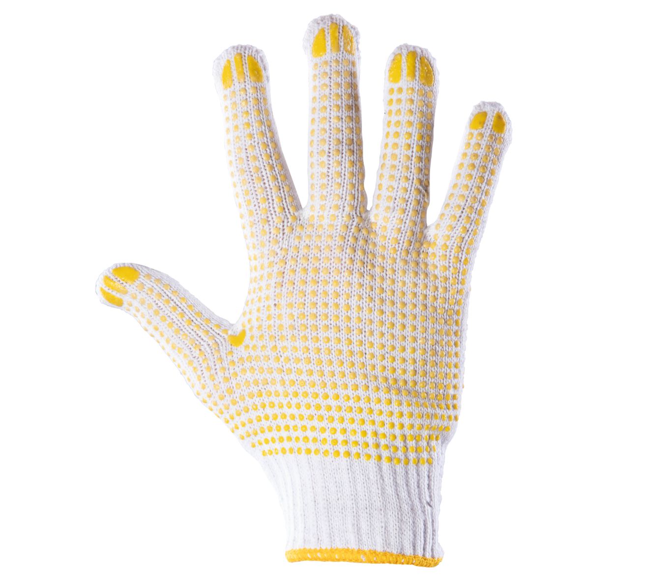 ..Rodzaj rękawicy:: rękawica dziana,; nakrapiana,; ..Część dłoniowa:: żółte nakropienie PCV,; występuje w części dłonnicowej oraz grzbietowej,; ..Materiał/Dzianina:: wykonane z dzianiny będącej mieszanką bawełny i poliestru,; ..Mankiet/zakończenie:: zakończona ściągaczem,;