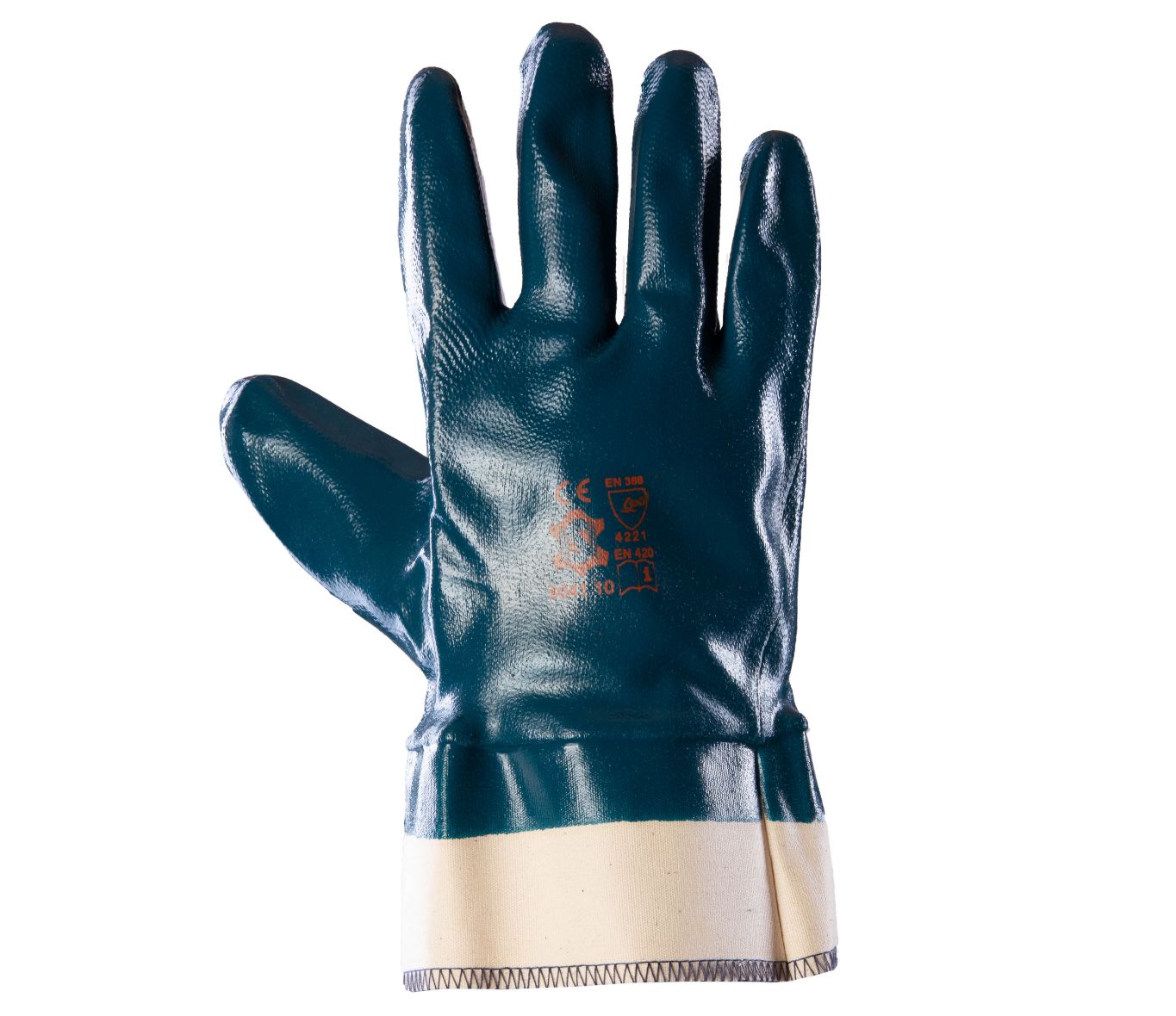 ..Rodzaj rękawicy:: rękawica powlekana,; ..Część dłoniowa:: Powleczenie pełne,; powleczona nitrylem,; w kolorze ciemnoniebieskim,; ..Materiał/Dzianina:: w kolorze naturalnym,; wykonane z bawełny,; ..Mankiet/zakończenie:: wykonany z usztywnionego drelichu,; ..EN 388 – Odporność na uszkodzenia mechaniczne:: 4: odporność na ścieranie,; 2: odporność na przecięcie,; 1: odporność na przebicie,; 2: odporność na przedarcie,; X – odporność na przecięcie wg ISO 13997;