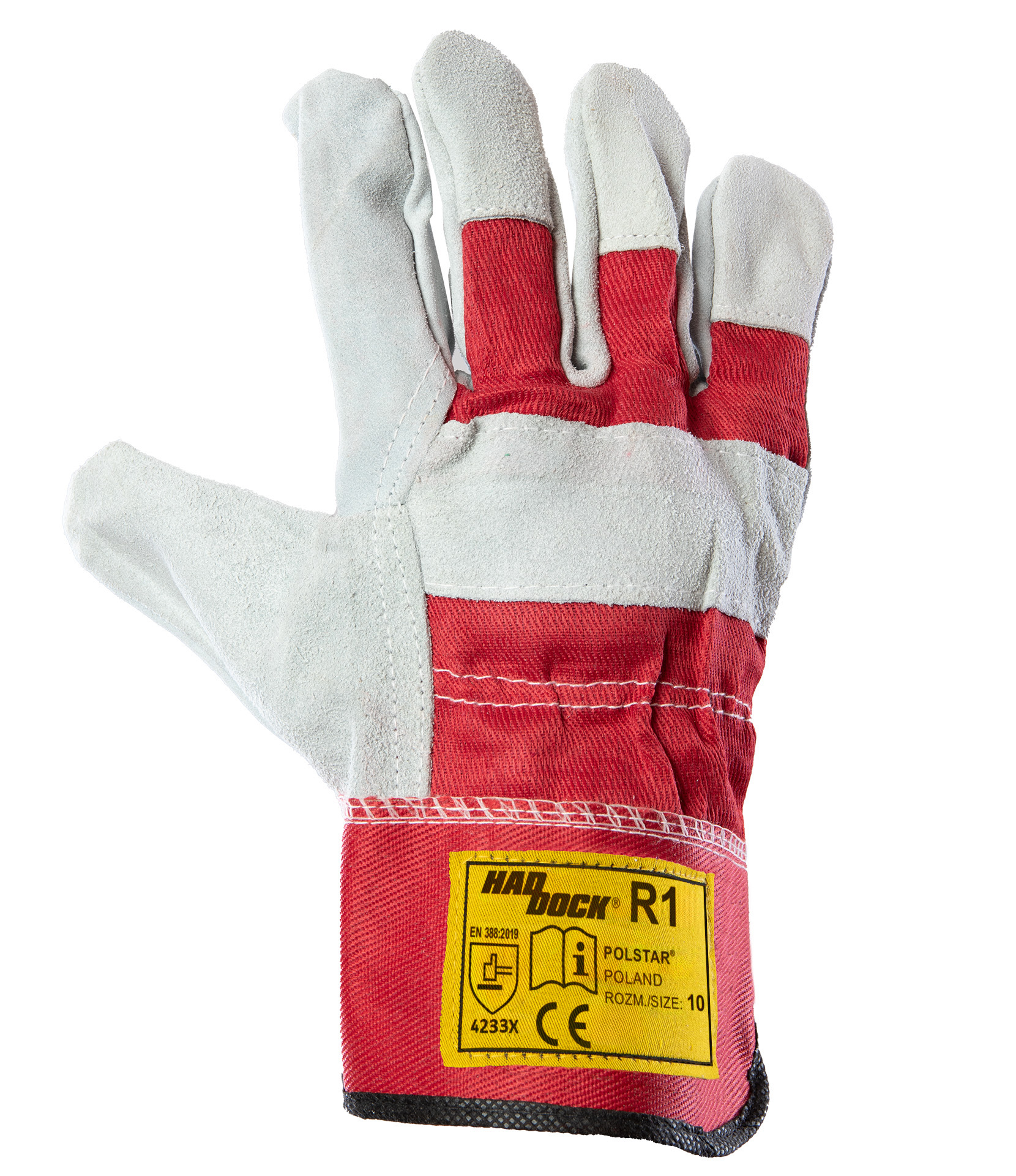 ..Rodzaj rękawicy:: rękawica wzmacniana skórą,; ..Część dłoniowa:: kciuk wykonany ze skóry,; w kolorze jasnoszarym; dwoina bydlęca,; ..Materiał/Dzianina:: wypodszewkowane jednostronnie,; w kolorze czerwonym,; drelich bawełniany,; ..Mankiet/zakończenie:: zakończona sztywnym mankietem,; mankiet podgumowany,; z metką w kolorze czarno-żółtym z logo HADDOCK,; ..EN 388 – Odporność na uszkodzenia mechaniczne:: 4: odporność na ścieranie,; 2: odporność na przecięcie,; 3: odporność na przedarcie,; 3: odporność na przebicie,; X – odporność na przecięcie wg ISO 13997;