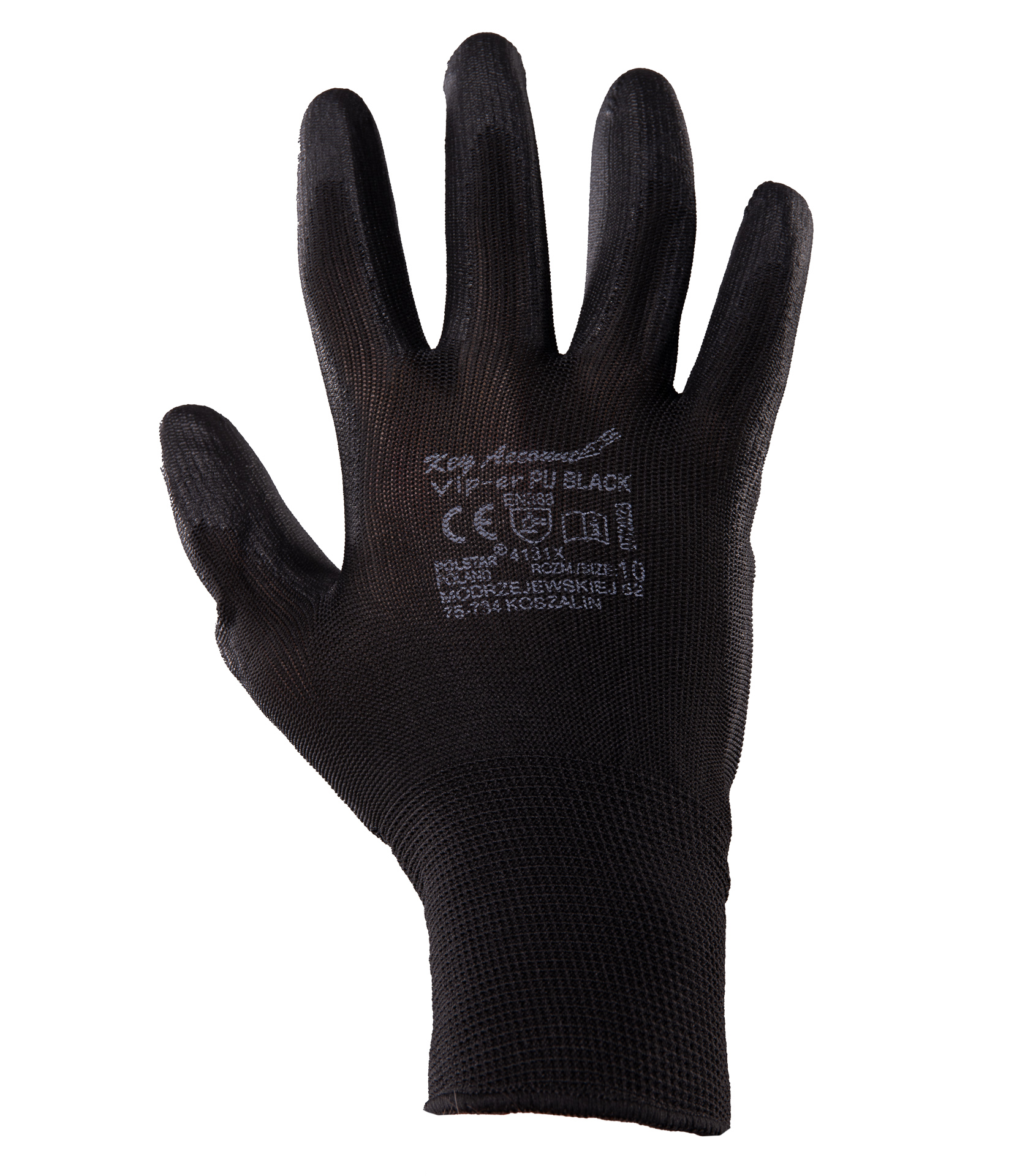 ..Rodzaj rękawicy:: rękawica powlekana,; ..Część dłoniowa:: Powleczenie ½,; w kolorze czarnym,; Powleczona poliuretanem,; ..Materiał/Dzianina:: w kolorze czarnym,; ścieg 13G,; dzianina poliestrowa,; ..Mankiet/zakończenie:: zakończona ściągaczem,; ..EN 388 – Odporność na uszkodzenia mechaniczne:: 1: odporność na przecięcie,; 3: odporność na przedarcie,; 1: odporność na przebicie,; 4: odporność na ścieranie,; X – odporność na przecięcie wg ISO 13997;