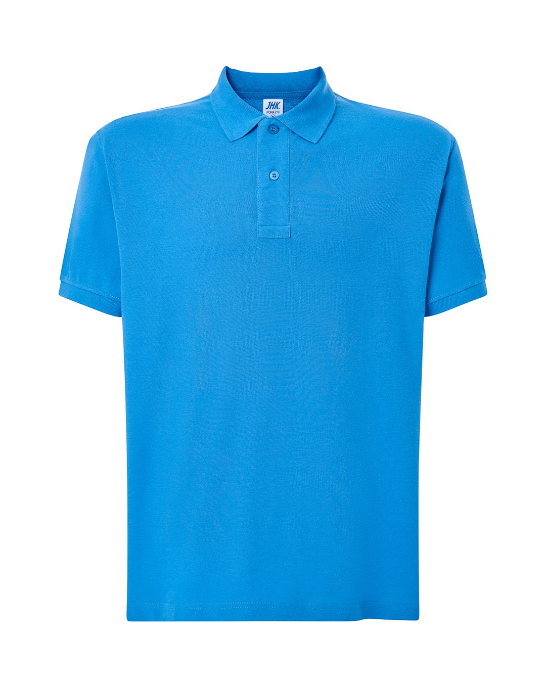 Polo męskie z krótkim rękawem. Zapinane na dwa guziki. Kołnierzyk i rękawy wykończone dzianiną 1×1. Boczne rozcięcia. 100% stabilizowana bawełna czesankowa pique.