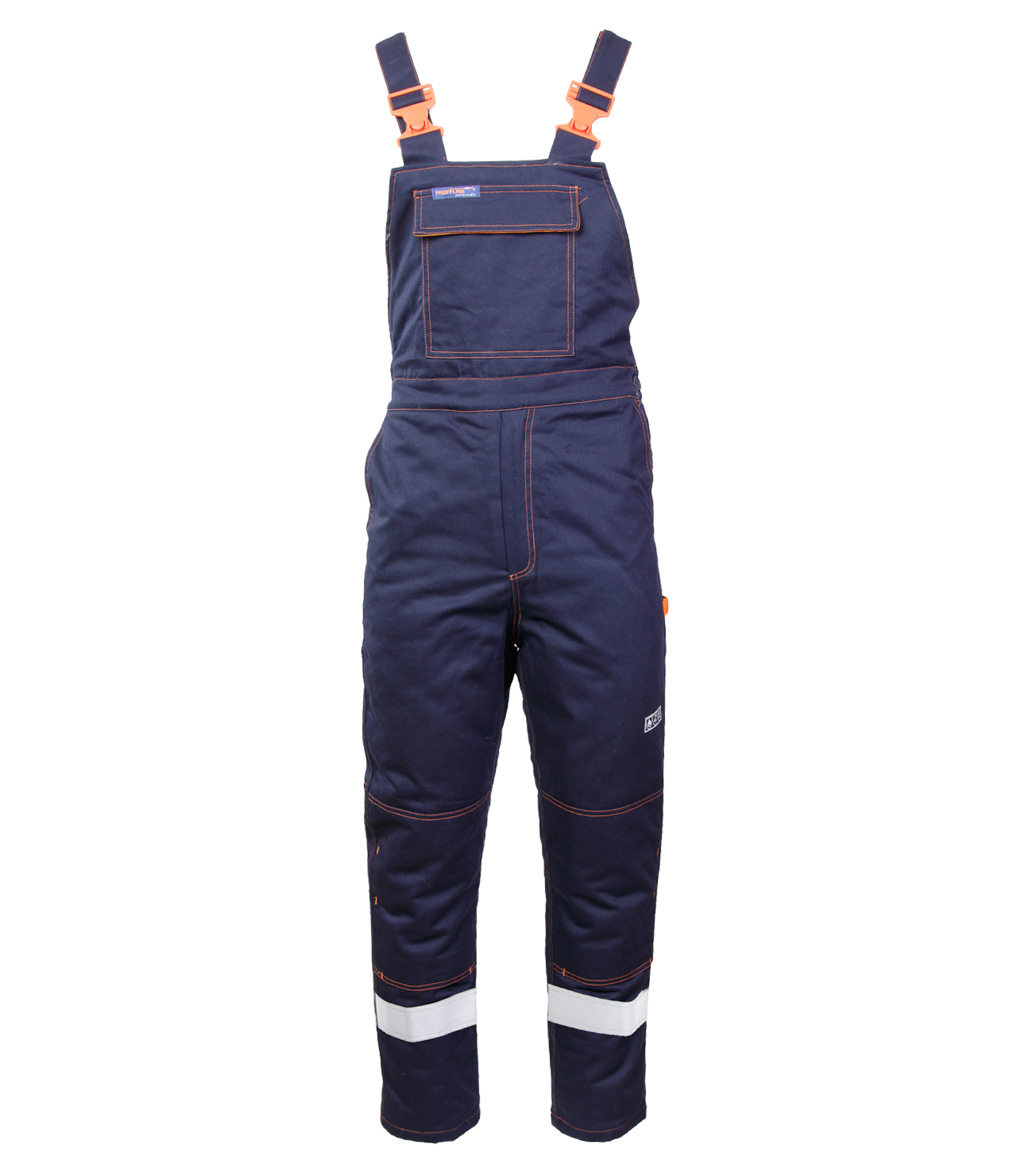 .Szelki:: długie, szerokie, regulowane szelki,; .Ocieplina:: ocieplina 100% poliester, 120g/m2 +/-3%,; .Podszewka:: podszewka 100 % bawełna,; .Budowa/szycie:: podwójne szwy, szyte widoczną, mocną nicią,; wykonane z wysokiej jakości materiału, który zapewnia po wielokrotnym praniu stabilność kolorów i rozmiarów,; duża ilość ryglówek w miejscach szczególnie narażonych na rozprucie,; .Kieszenie:: kieszeń na miarkę „metrówkę”,; dwie kieszenie boczne,; szlufka na młotek,; dodatkowa kieszeń monterska,; .Regulacja obwodu:: możliwość regulacji w pasie za pomocą guzików oraz gumki wszytej w tylnej części spodni,;