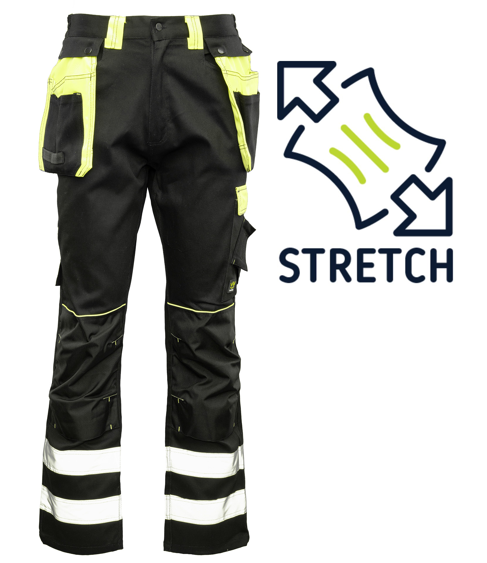 .Materiał:: 97% bawełna/ 3% spandex,; wykonana z wysokiej jakości materiału, który nawet po wielokrotnym praniu zapewnia stabilność rozmiarów,; .Budowa/szycie:: podwójne szwy, szyte mocną nicią,; kontrastowa lamówka,; wstawki kolorystyczne,; duża ilość ryglówek w miejscach szczególnie narażonych na rozprucie,; spodnie posiadają szlufki na pasek,; .Kieszenie:: kieszeń na miarkę „metrówkę”,; wzmocnione kieszenie boczne,; kieszeń na komórkę,; kieszeń na dokumenty,; ergonomiczna kieszeń na nakolanniki wykonana z CORDURY,; dwie kieszenie w tylnej części spodni,; dwie odpinane kieszenie monterskie,; .Elementy odblaskowe:: lamówka odblaskowa,; pasy odblaskowe,;