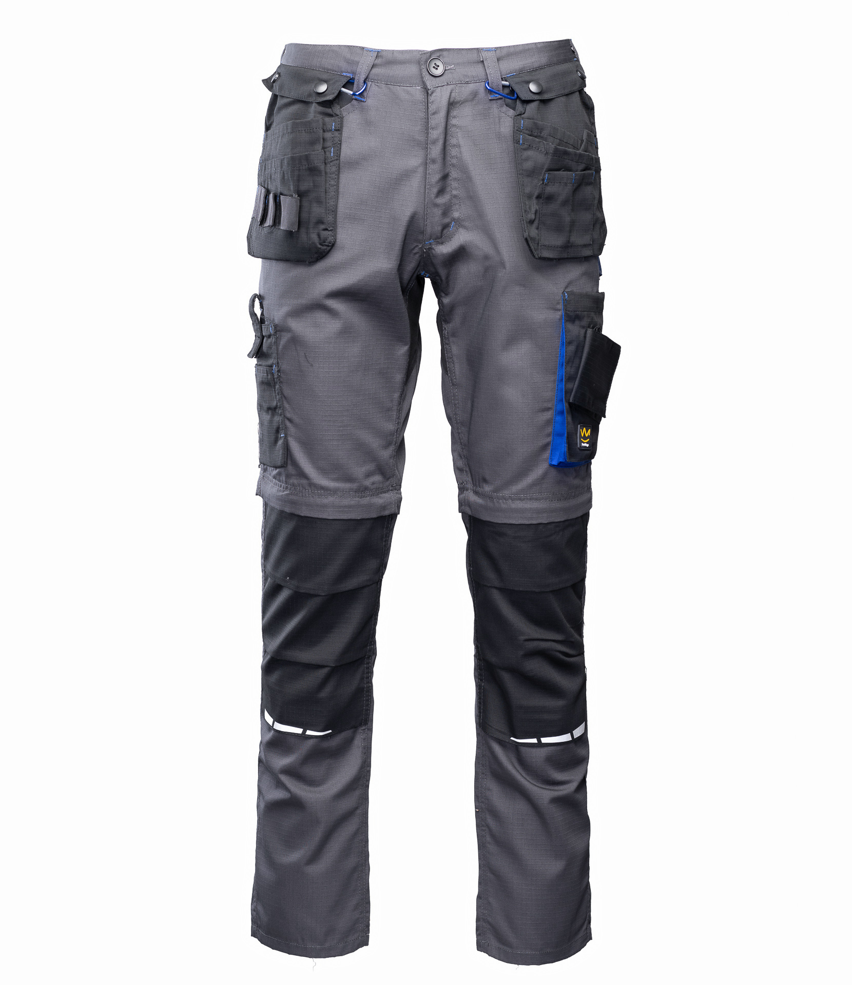 .Materiał:: wykonany z wysokiej jakości materiału, który nawet po wielokrotnym praniu zapewnia stabilność rozmiarów i kolorów,; 65% poliester/ 35% bawełna, gramatura 260 g/m2,; .Budowa/szycie:: podwójne szwy, szyte mocną nicią,; kontrastowa lamówka,; wstawki kolorystyczne,; duża ilość ryglówek w miejscach szczególnie narażonych na rozprucie,; spodnie posiadają szlufki na pasek,; szlufka na młotek,; odpinane nogawki,; spodnie posiadają wszyty klin ze stretchu w kroku zwiększający swobodę ruchów oraz komfort użytkownika,; .Kieszenie:: kieszeń na miarkę „metrówkę”,; wzmocnione kieszenie zapinane na rzepy,; wzmocnione kieszenie boczne,; kieszeń na komórkę,; dwie kieszenie boczne,; przestrzenne kieszenie,; kieszeń na dokumenty,; dwie kieszenie w tylnej części spodni,; ergonomiczna kieszeń na nakolanniki,; dwie kieszenie monterskie, dopinane na zamek; .Regulacja obwodu:: możliwość regulacji w pasie dzięki gumce,; .Elementy odblaskowe:: wstawki odblaskowe,;
