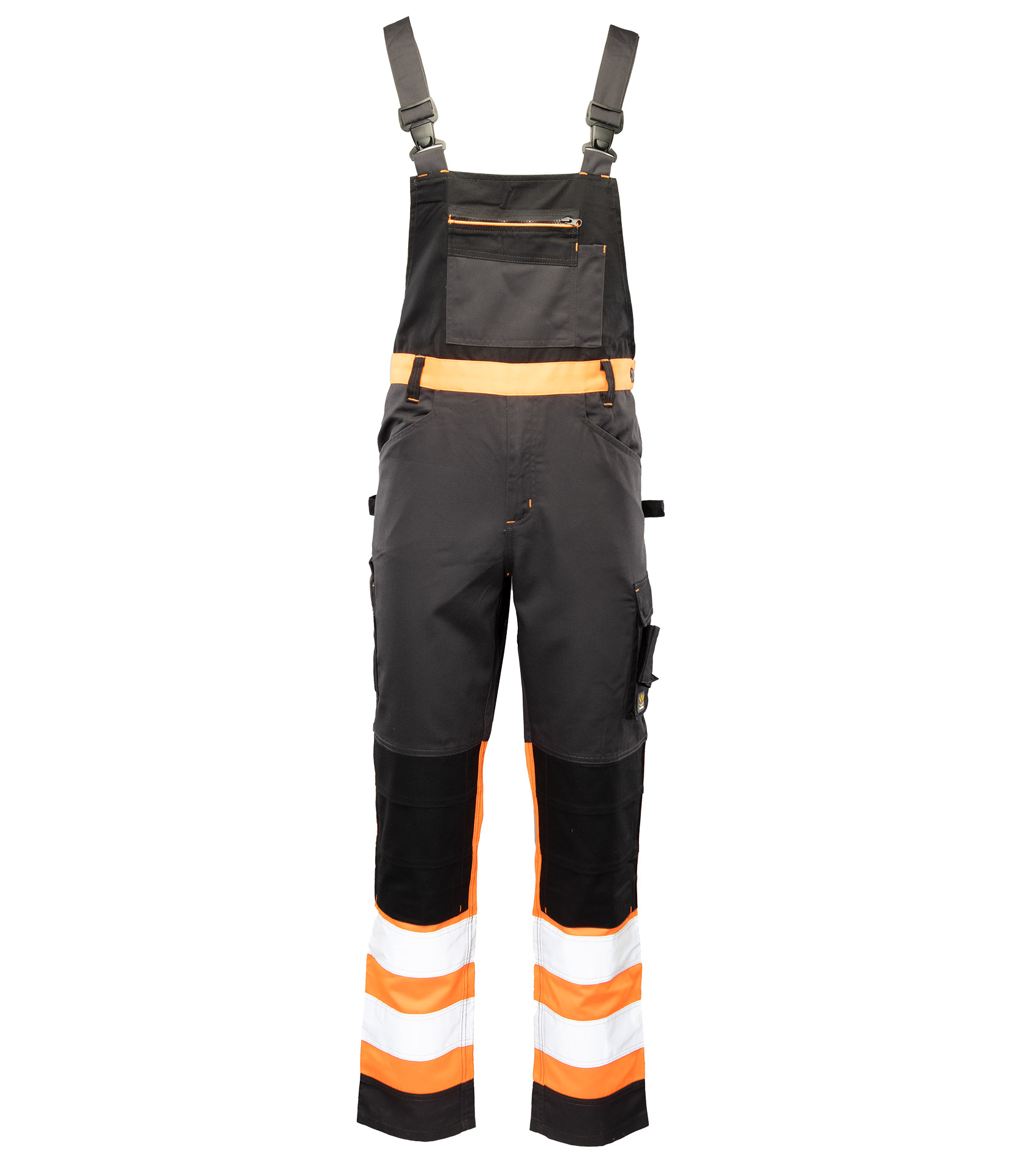 .Materiał:: wykonany z wysokiej jakości materiału, który nawet po wielokrotnym praniu zapewnia stabilność rozmiarów i kolorów,; .Budowa/szycie:: podwójne i potrójne szwy, szyte mocną nicią,; wstawki kolorystyczne,; duża ilość ryglówek w miejscach szczególnie narażonych na rozprucie,; kontrastowe ryglówki,; .Kieszenie:: kieszeń na miarkę „metrówkę”,; wzmocnione kieszenie boczne,; kieszeń na komórkę,; kieszeń na dokumenty,; dwie kieszenie w tylnej części spodni,; .Regulacja obwodu:: możliwość regulacji w pasie za pomocą guzików oraz gumki wszytej w tylnej części spodni,; .Elementy odblaskowe:: podwójne taśmy odblaskowe o właściwościach fluorescencyjnych,;