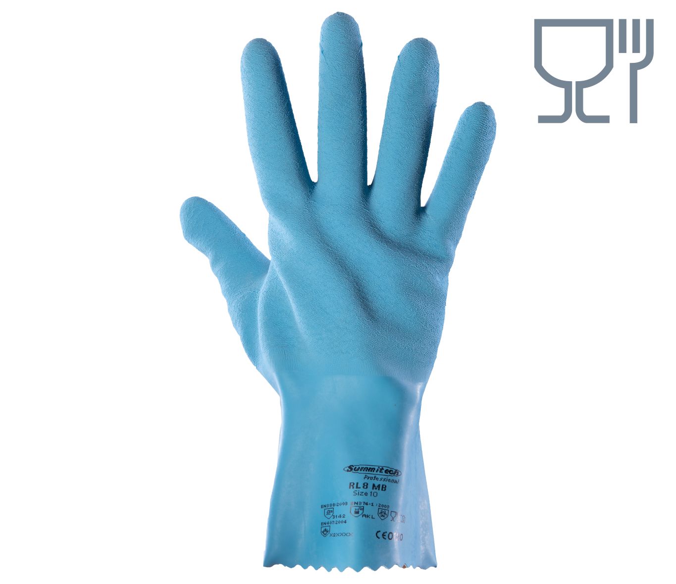 ..Rodzaj rękawicy:: rękawica chemiczna,; ..Długość rękawicy:: 300 mm,; ..Materiał/Dzianina:: w kolorze niebieskim,; rękawice wykonane z wodoodpornego naturalnego kauczuku na kanwie syntetycznej dzianiny nylonowej,; ..EN 388 – Odporność na uszkodzenia mechaniczne:: 3: odporność na ścieranie,; 1: odporność na przecięcie,; 4: odporność na przedarcie,; 2: odporność na przebicie,; X – odporność na przecięcie wg ISO 13997; ..EN 374-1 – Odporność na przenikanie substancji chemicznych:: A : Metanol,; K : Wodorotlenek sodu 40%,; L : Kwas siarkowy 96%,; ..EN ISO 374-5 : 2016 – Rękawice chroniące przed mikroorganizmami:: TAK; ..Rękawice dopuszczone do kontaktu z żywnością:: tak,;