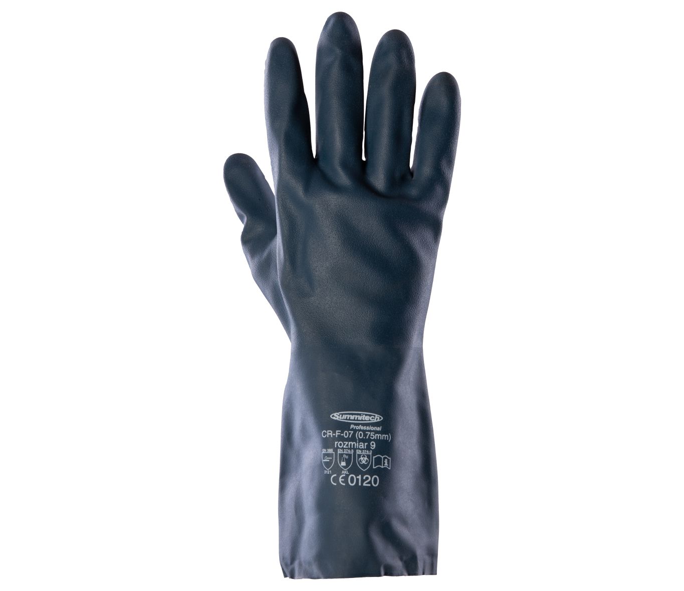 ..Rodzaj rękawicy:: rękawica chemiczna,; ..Długość rękawicy:: 330 mm,; ..Grubość rękawicy:: 0,75 mm; ..Materiał/Dzianina:: w kolorze granatowym,; wykonane z mieszanki neoprenowo-lateksowej,; ..EN 388 – Odporność na uszkodzenia mechaniczne:: 3: odporność na ścieranie,; 1: odporność na przecięcie,; 2: odporność na przedarcie,; 1: odporność na przebicie,; X – odporność na przecięcie wg ISO 13997; ..EN 374-1 – Odporność na przenikanie substancji chemicznych:: A : Metanol,; K : Wodorotlenek sodu 40%,; L : Kwas siarkowy 96%,; ..EN ISO 374-5 : 2016 – Rękawice chroniące przed mikroorganizmami:: TAK;