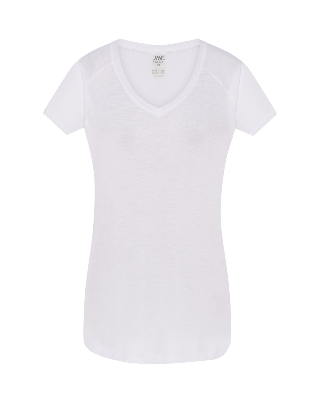 Damski Tshirt z rękawkami typu reglan. Single jersey, rękawki zawinięte. Modny niski ściągacz typu V-Neck. 100% bawełna.
